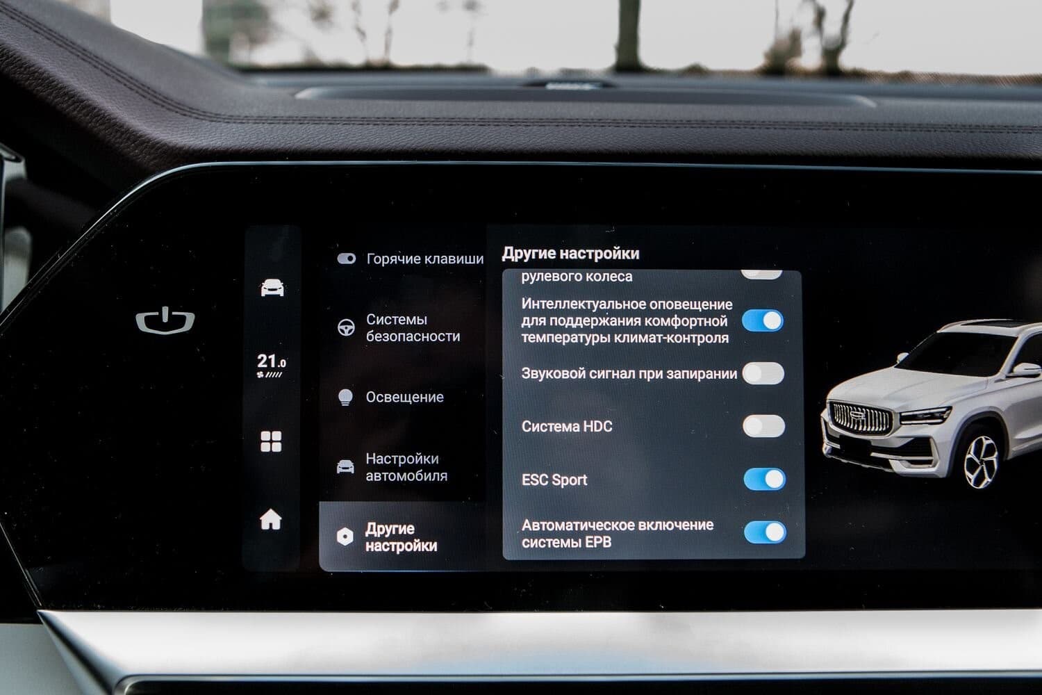 Каждый кроссовер Gilli Манджаро имеет блок камер кругового обзора 360° с секцией LDP. На китайском джипе предусмотрен бесключевой доступ. Также у Джили Манджаро есть автозапуск. Он активируется путем нажатия комбинации кнопок на брелке машины. При недостаточности топлива в баке Джили Маджаро автозапуск не сработает.